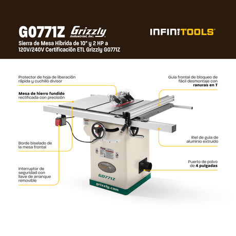 Sierra de mesa híbrida de 10" y 2 HP 120V/240V Certificación ETL Grizzly G0771Z