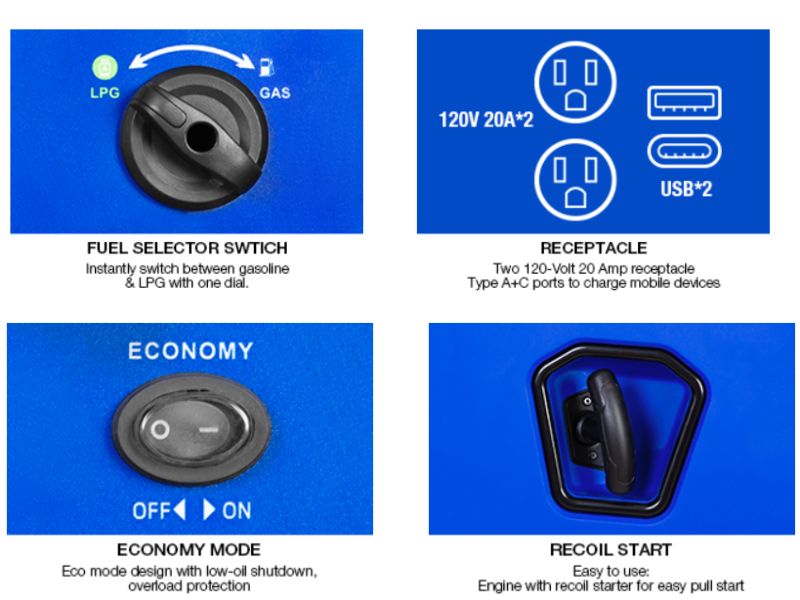 La flexibilidad del combustible dual permite un cambio perfecto entre gasolina y propano mediante un selector simple, al tiempo que ofrece hasta 4500 vatios de arranque con gasolina y 4150 con propano para garantizar un rendimiento constante según la disponibilidad o preferencia de combustible.