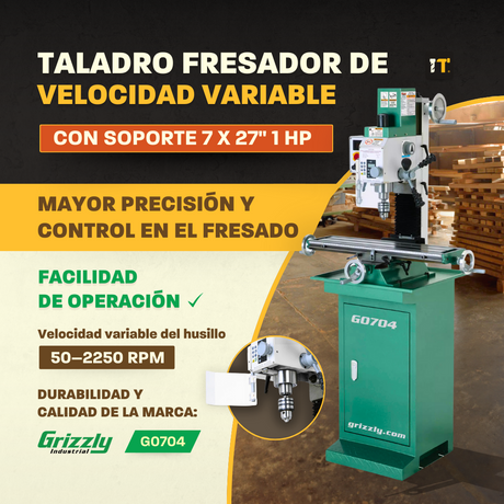 Taladro fresadora de 7" x 27" y 1 HP de velocidad variable con soporte Grizzly G0704