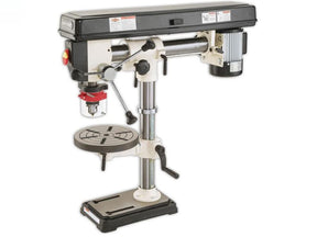 El taladro radial de banco Shop Fox W1669 de 34" cuenta con un motor de 1/2 HP que impulsa suavemente las cinco velocidades del husillo que van desde 550 a 3000 RPM.